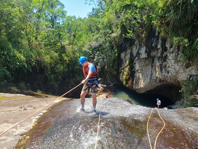O rapel é indicado para iniciantes, e a inclinação gradual da rampa de 30 metros permite uma descida tranquila e sem esforço.