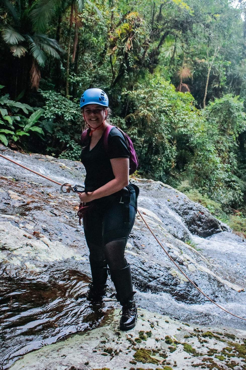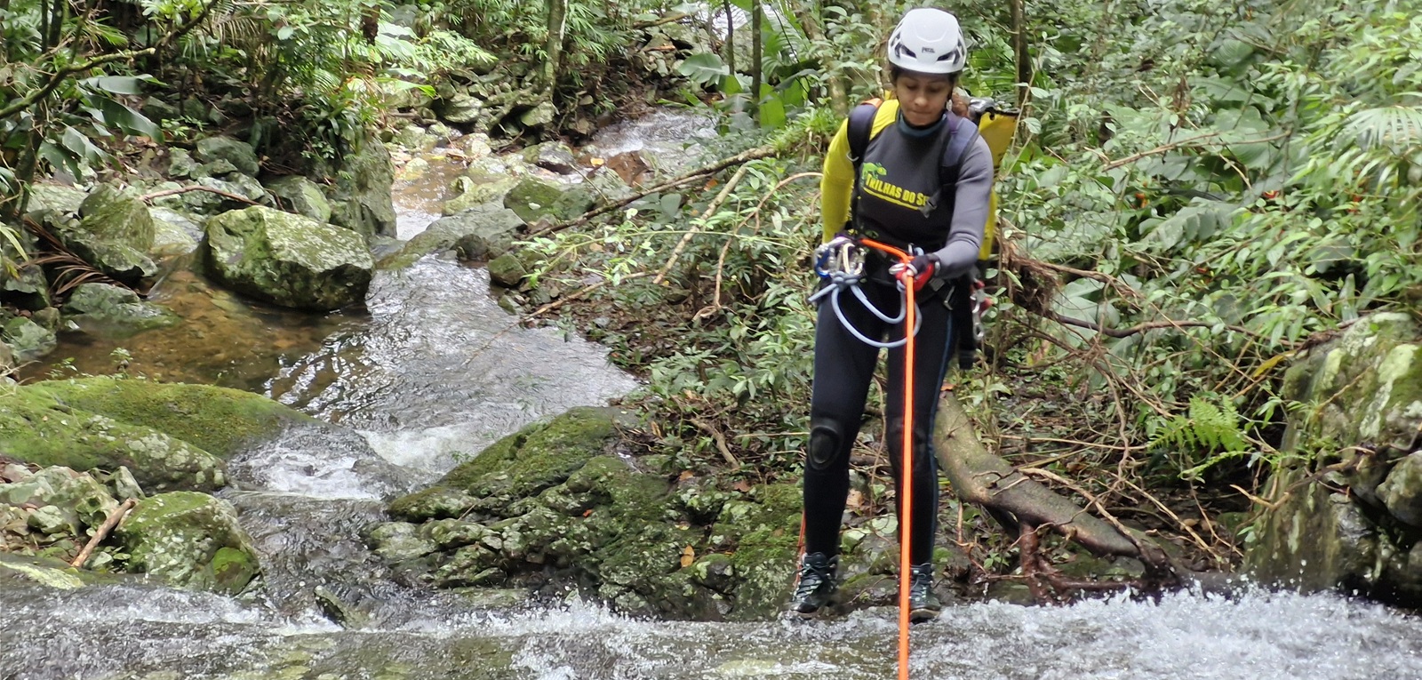 Terreno: trilha com pedras, caminhada em leito de rio com pontos escorregadios, rapel em cachoeiras de nível fácil